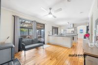 Inside, polished timber flooring flows throughout the open plan living area, warmed by slow combustion wood heating and seamlessly connecting to the enclosed raised pergola overlooking the private rear yard. The modern kitchen features a pantry, dishwasher and electric cooking, with the adjoining lounge room providing abundant natural light and year-round comfort with a reverse cycle split system.