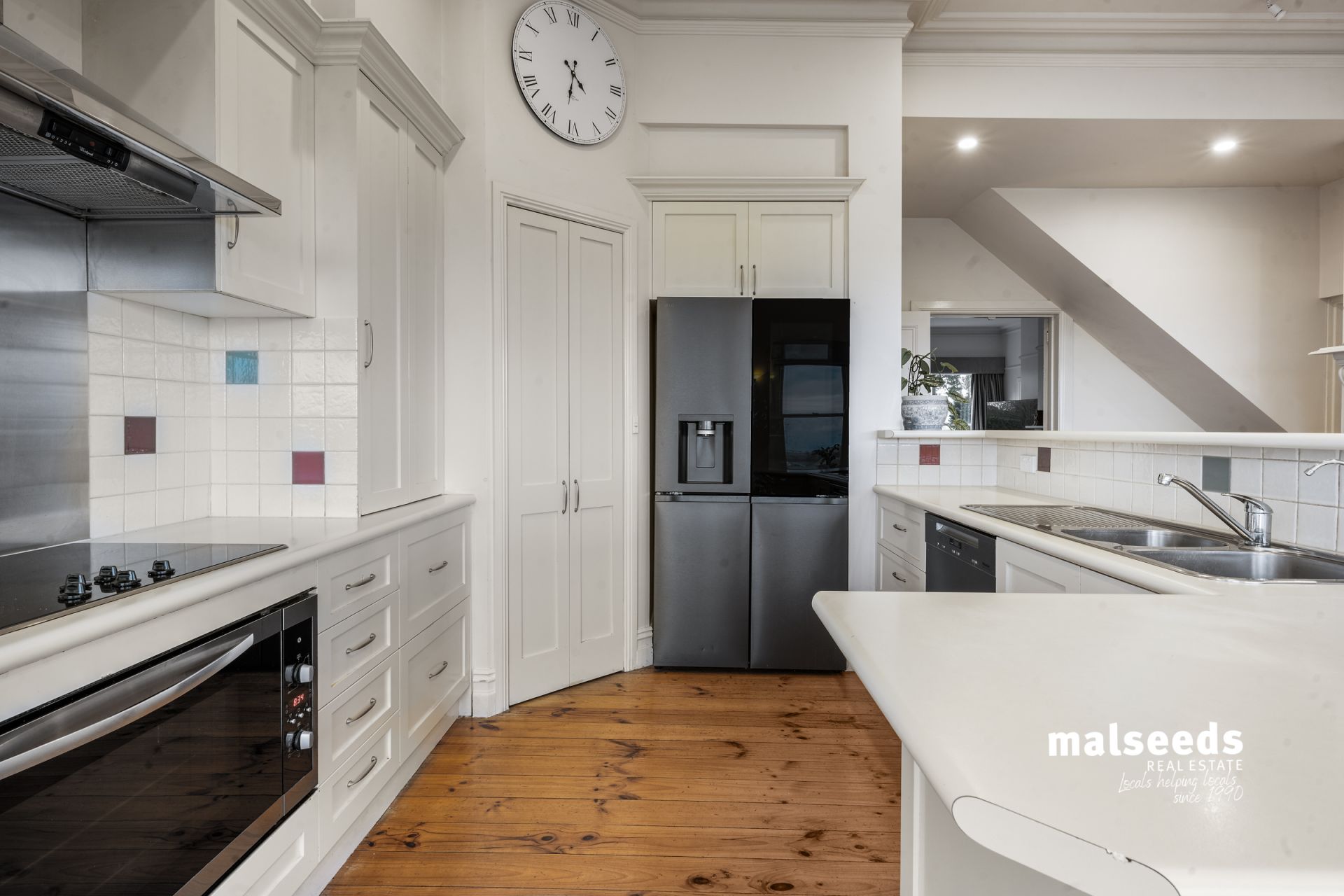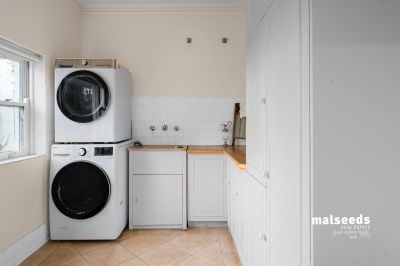 The home chef will appreciate the kitchen's Baumatic 900mm electric oven, Miele dishwasher, electric cooktop, double sink, and ample storage. Adjoining is an informal meals area perfect for everyday family dining. Beneath the timber floors is a hidden concrete-lined wine cellar, ideal for collectors and entertainers.