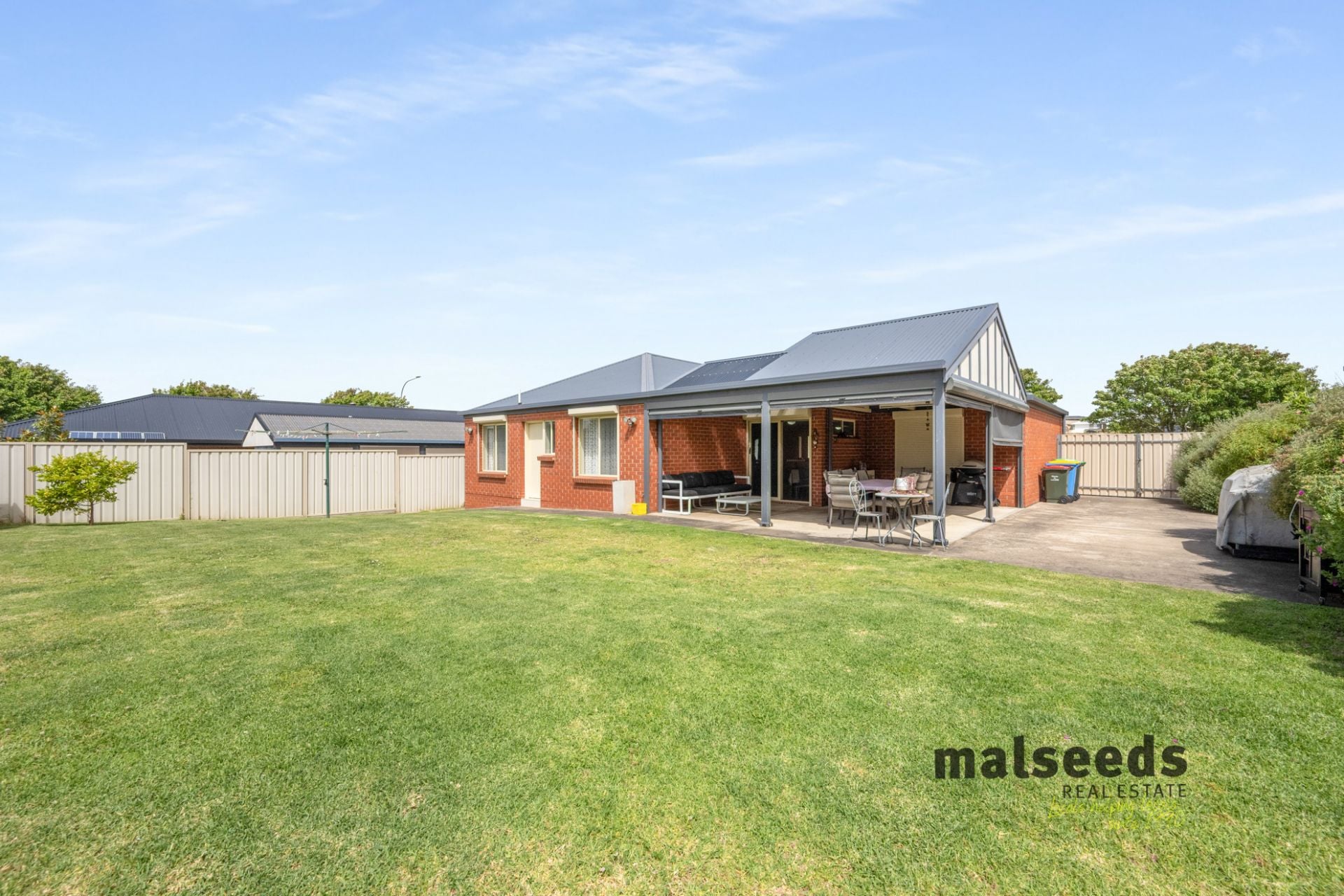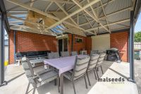 Additional features include roller shutters throughout the home, an undercover car garage under the main roof, laundry with direct access to the rear yard, and convenient side access to the property. The outdoor space is easy to maintain and perfect for entertaining, with an undercover outdoor area fitted with blinds, neat veggie garden beds, a garden shed, and a beautifully established yard featuring a variety of fruit trees including apricot, plum, lemon, mandarin and orange.