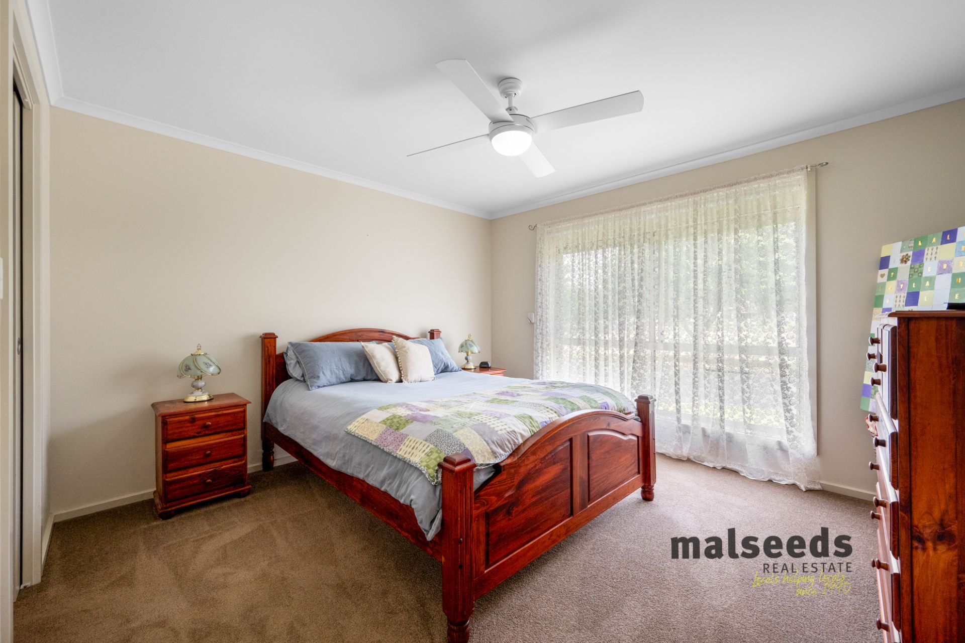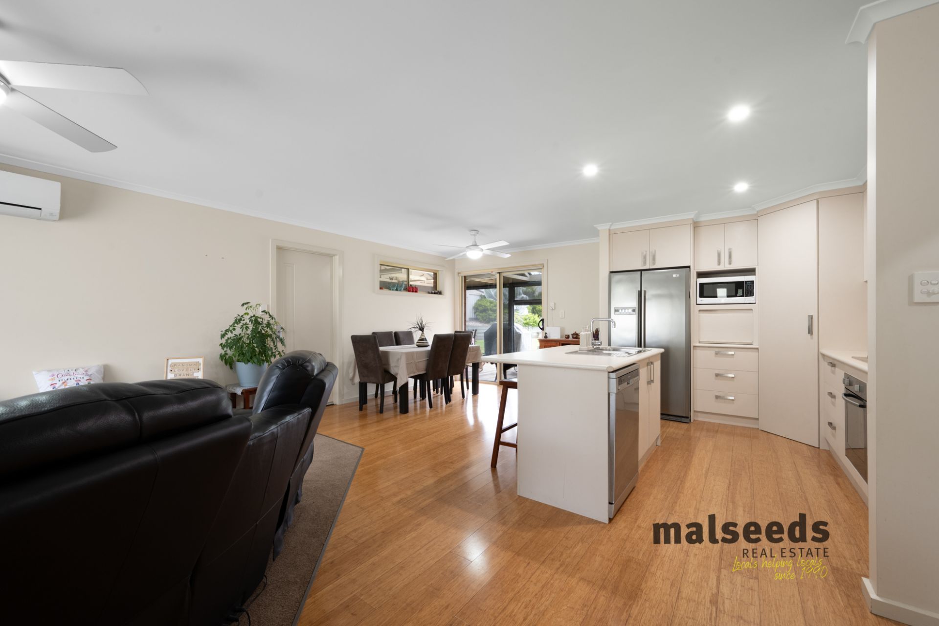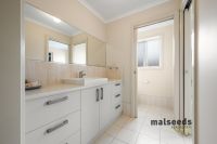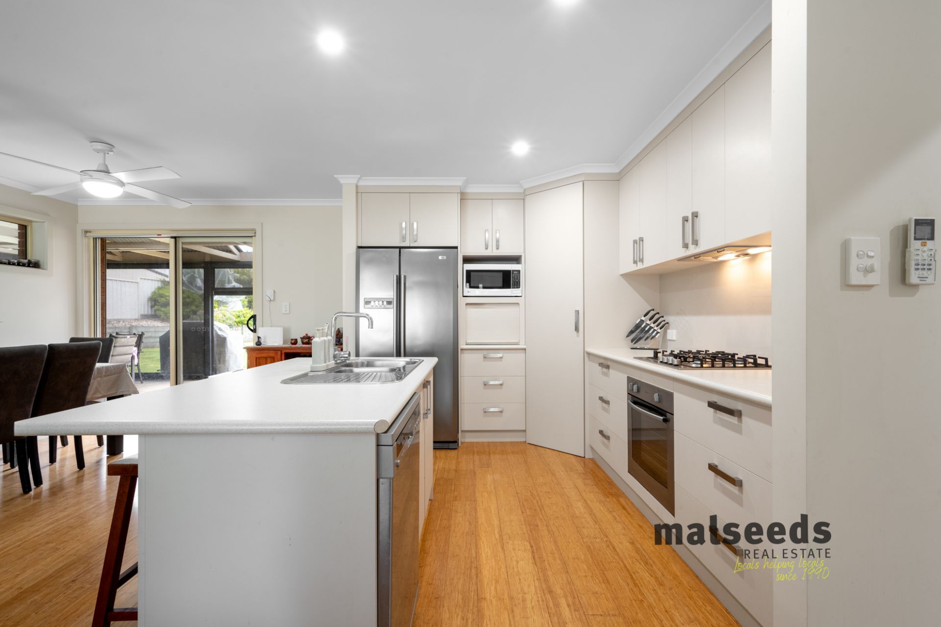 The open plan living, dining and kitchen area forms the heart of the home, offering a light filled and functional space ideal for everyday living. The kitchen is well appointed with Westinghouse appliances, including a dishwasher and oven, gas cooking, a step in pantry, dedicated bread nook and ample storage throughout, making it practical and family friendly. The living areas are complete with 3 speed ceiling fans and roller shutters, providing comfort and climate control all year round.