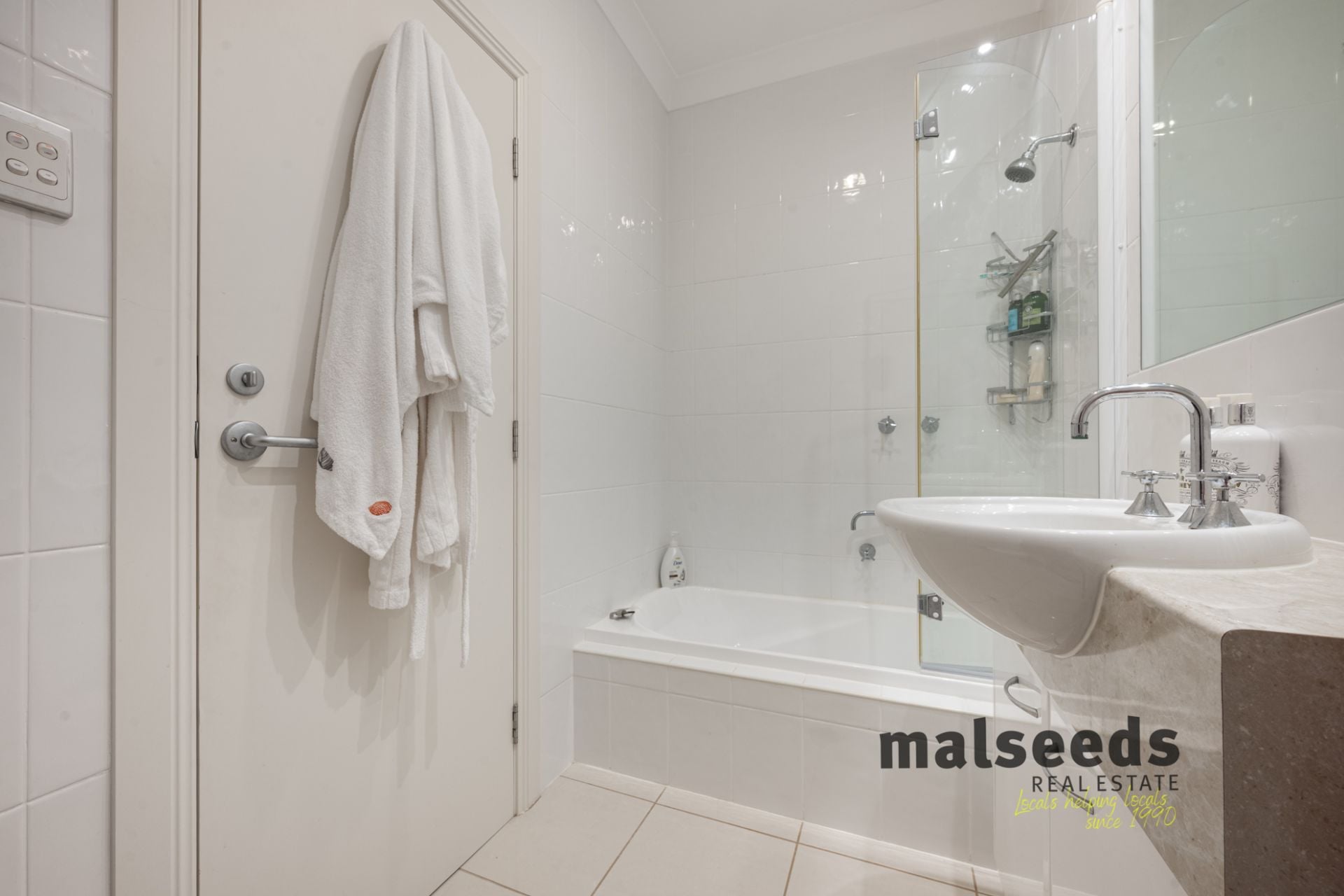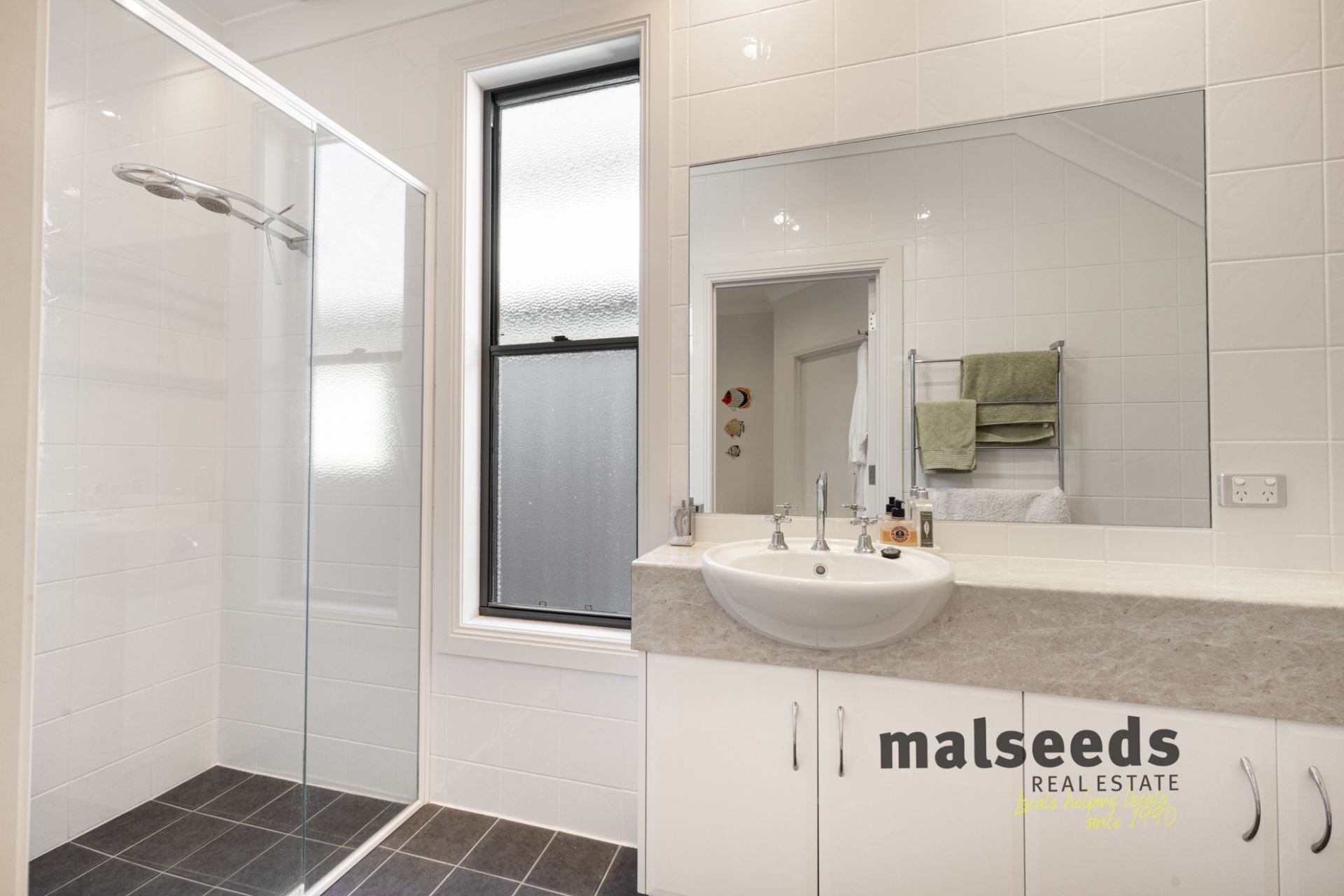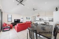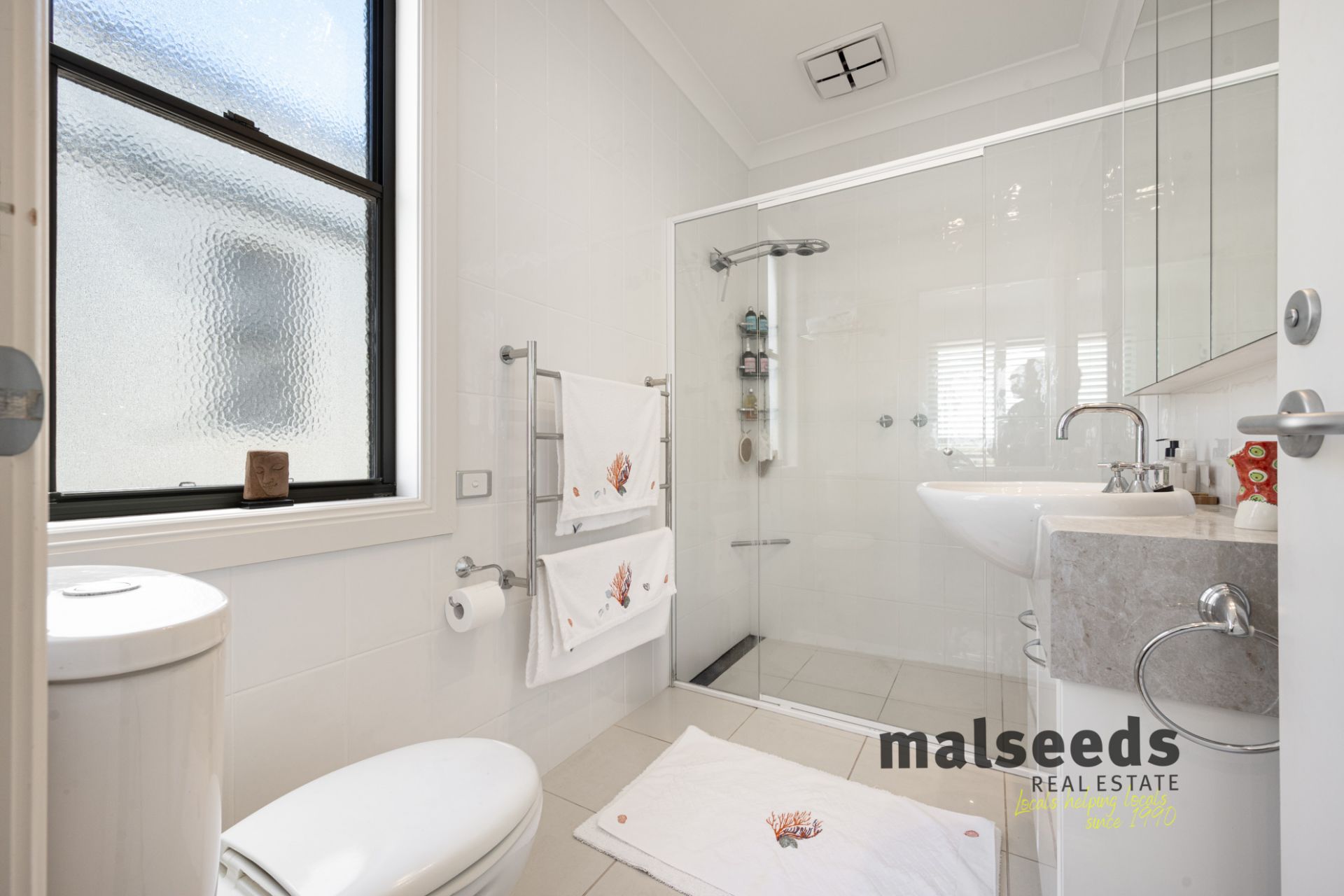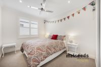 Accommodation is generous, with four large bedrooms, all featuring built-in wardrobes and ceiling fans. The master suite offers a luxurious retreat complete with walk-in wardrobe and ensuite. Two additional bathrooms service the home, including an upstairs bathroom with bath and a downstairs bathroom servicing the lower-level bedrooms, providing excellent functionality for families and guests.