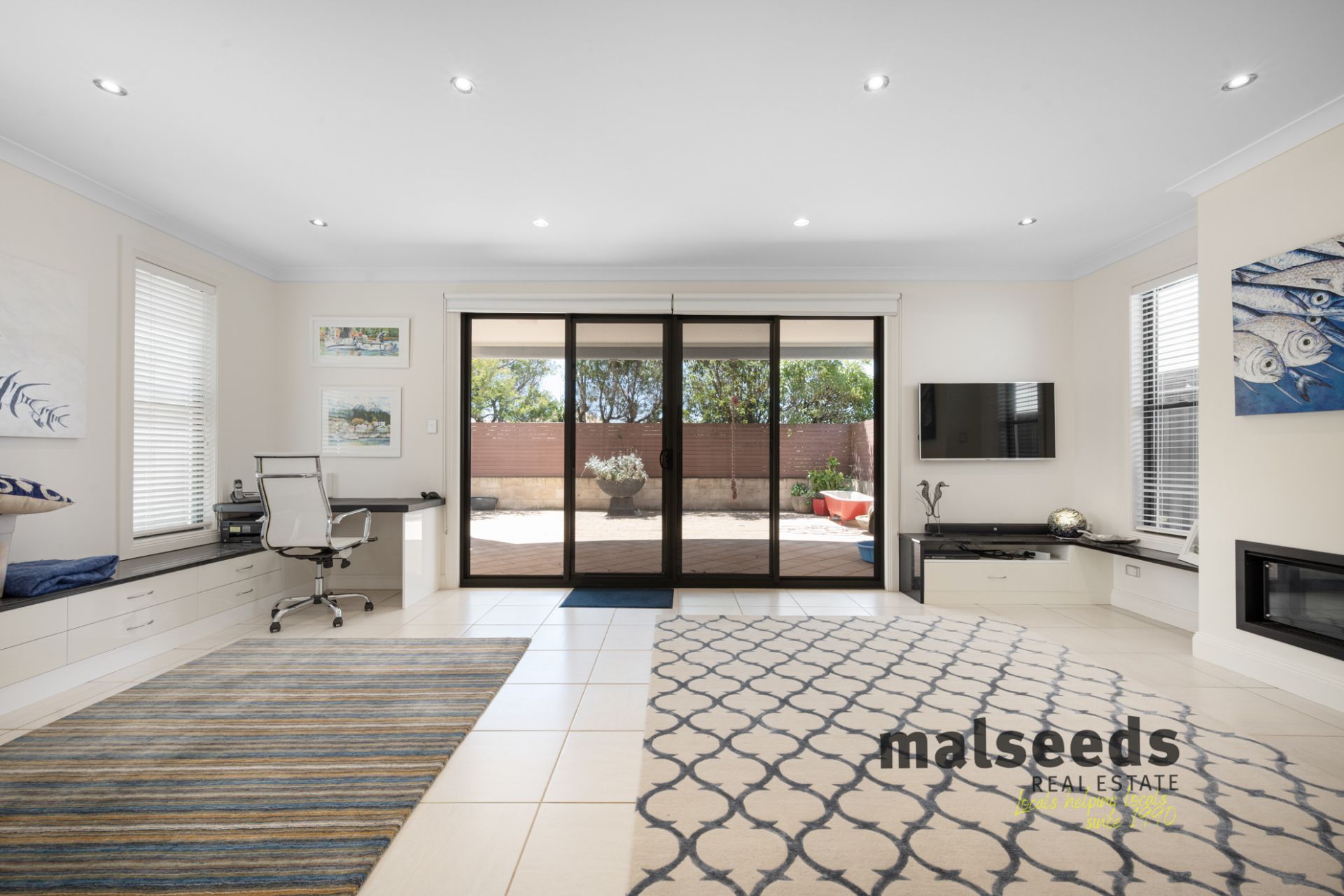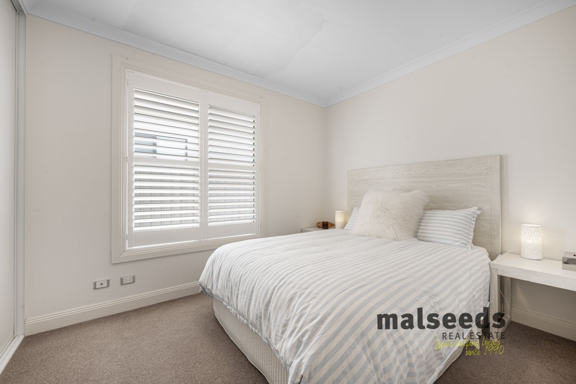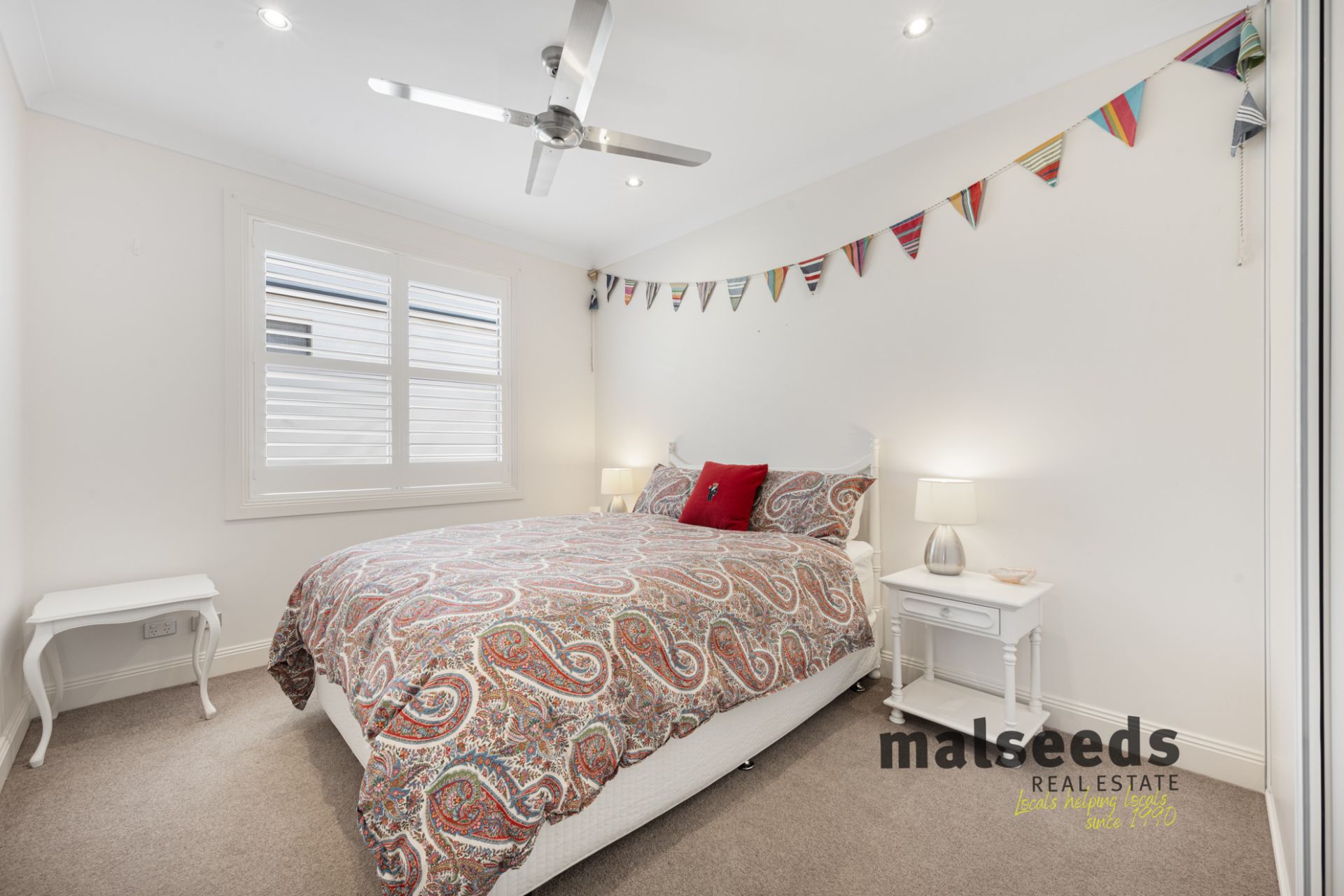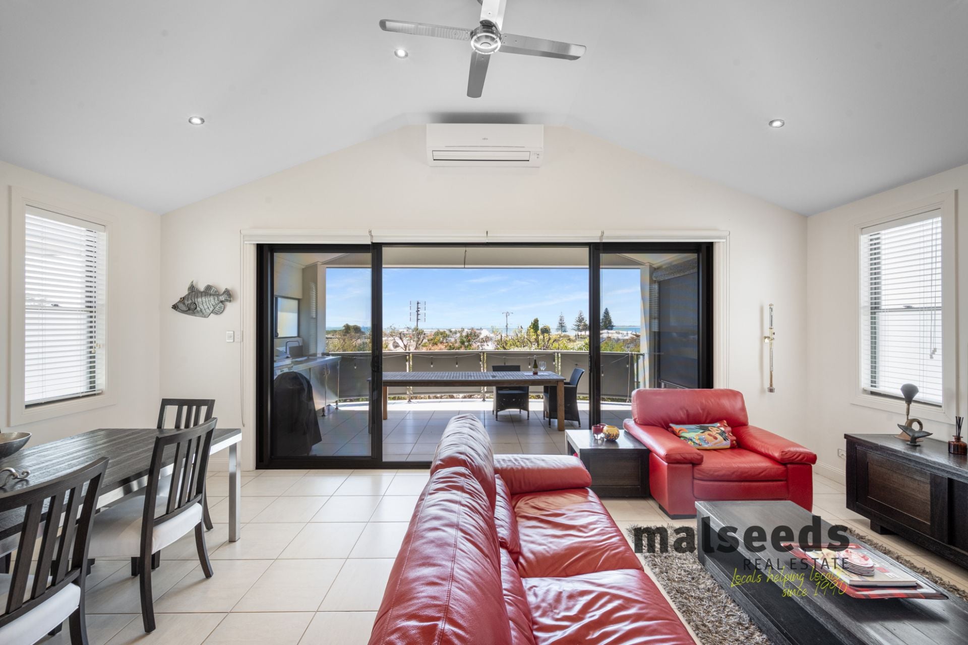 Roman shutters and ceiling fans are fitted throughout the home, enhancing both comfort and style. The gardens are minimal and easy-care, making this a true lock-and-leave coastal property. Secure parking is provided by a garage under the main roof, complete with additional tool storage.